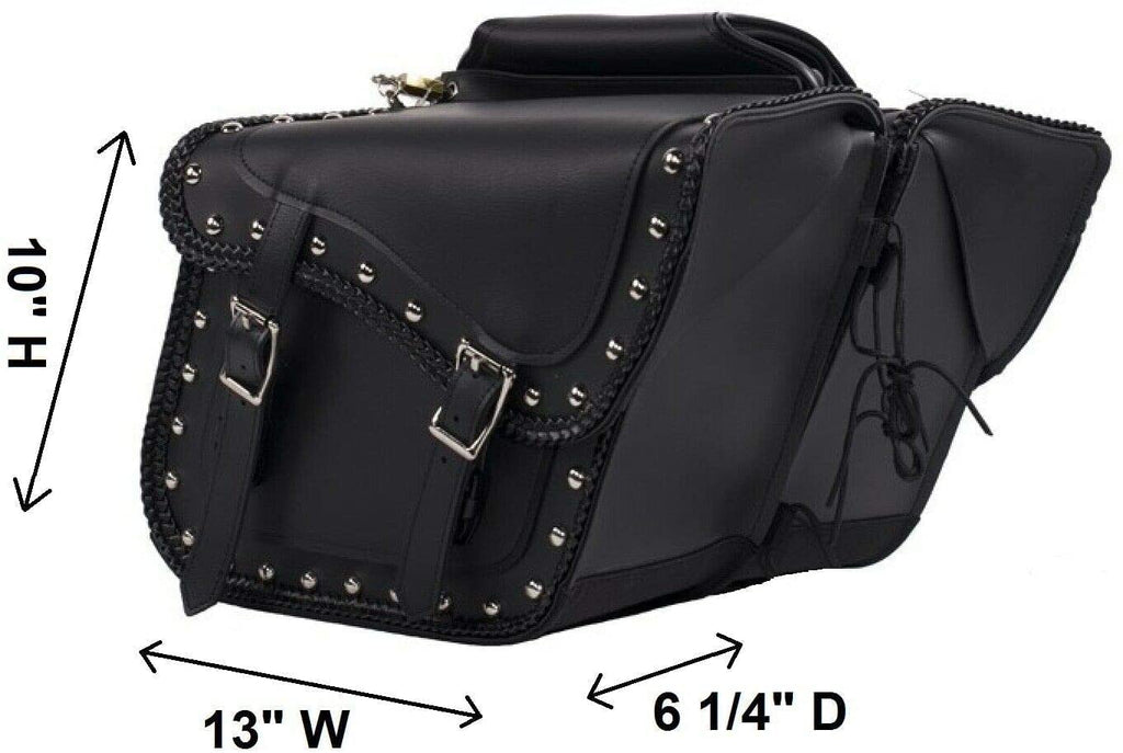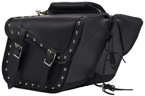 EXCELSIOR INT UNISEX SYNTHETIC LEATHER UNIVERSAL BRAIDED & STUDDED SLANTED THROW OVER WITH QUICK RELEASE BUCKLES MOTORCYCLE SADDLEBAG- BLACK