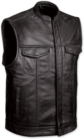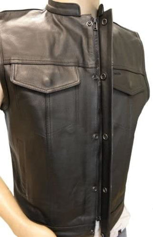 SOA Men's anarchy black leather vest, 2 front pockets, Gun pocket w/ strap, Made from top-grade heavy duty soft genuine leather. The vest has lined 4 Hidden Snaps 2 Front Pockets, 2 slash side pockets. 1 Panel back for club colors & patches. 2 Inside Pockets on each side (6 Total) How to Size Start by wearing clothes of weight you think you’ll be wearing when you use the gear you want to buy.
