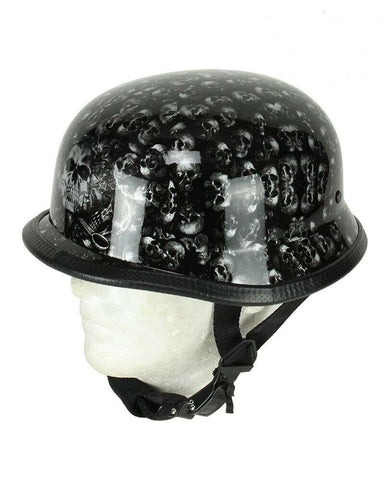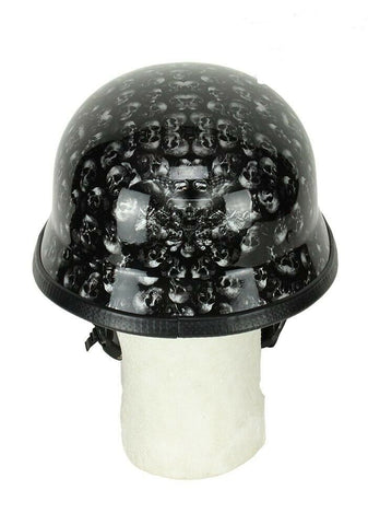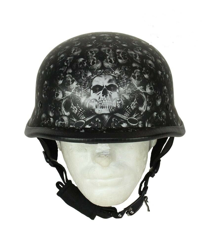 This gorgeous gray german novelty helmet is quite an eye-catching sight to look at as it is completely covered with a very unique skull design. Along with that, a stylish fiberglass shell with steel rivets that secure y-strap to lid and padded lining for a comfort. The Nylon Y-strap retention system and adjustable quick release chin strap make for easy adjustment. Novelty Items Do Not Meet D.O.T. Standards,