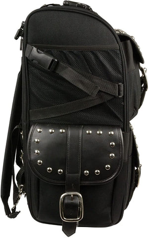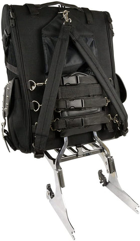 Big, full-side openings allow easy access to bag contents while the bag is still mounted on the bike. A fully adjustable sissy bar mounting system goes on in seconds over any size and style sissy bar pad; once adjusted for your size pad, you never need to adjust it again Constructed of UV-, water-and weather-resistant 1200-denier SaddlerTuff and leather-like, maintenance-free SaddleHyde panels Rigid construction holds bag shape even when empty Roll bag included for extra cargo capacity; and its separate mounting system allows independent installation on rack, seat, or sissy bar Top pocket office organizer and lockable zipper pulls Built-in pocket with rain cover Comes with 1/2" chrome studs