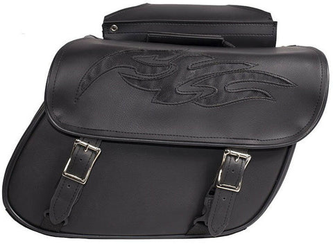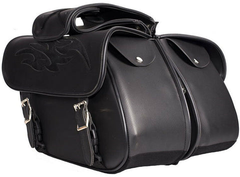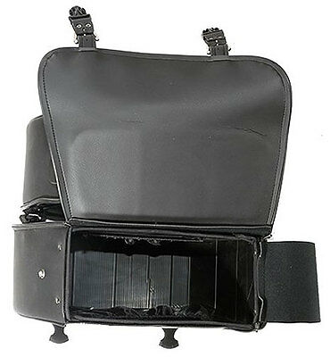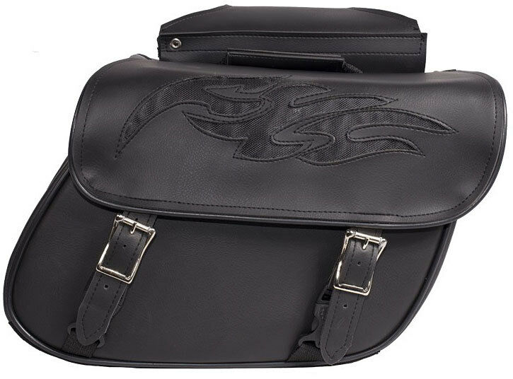 High quality throwover style saddlebags hold their shape and will not turn white in extreme heat. Universal fitting with quick-release strap buckles. Quick-release system allows you to remove each bag and carry them with you if needed. Carrying handles are built in to each bag for ease of use. Fits many makes and models but please check size for fitment (below).