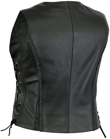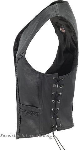 EXCELSIOR INT WOMEN'S CONCEALED CARRY SLEEVELESS LEATHER VEST WITH FRONT AND BACK BRAID SIDE LACES MOTORCYCLE RIDER JACKET FOR WOMENS