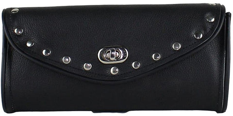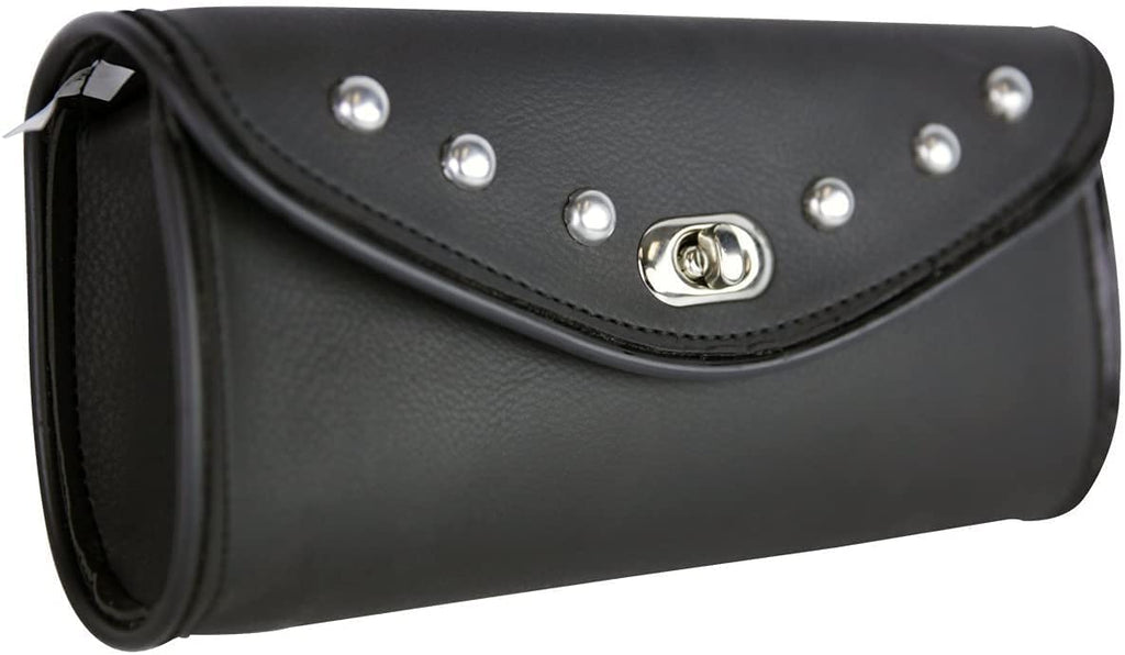 - HIGH QUALITY: Heavy Duty PVC 100% Waterproof Material Secure Turn Knob to Close The Flap Metal Plate on Back to attach to The Motorcycle Chrome Stud Design Screw is Just for reference, it is not included.